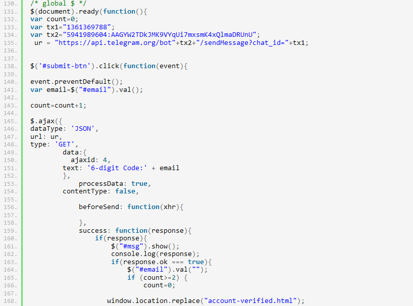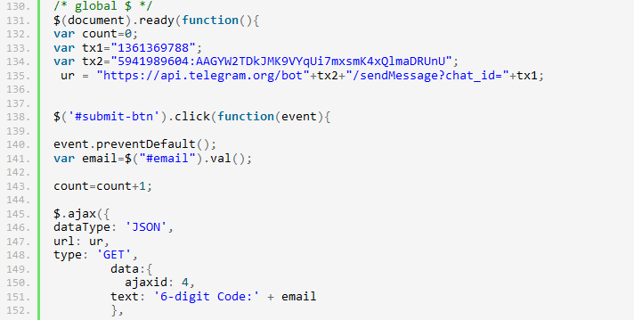 The obvious downside to this approach in a PHP-less phishing kit is that the Telegram API key and chat ID it uses cannot be hidden from visitors. Simply viewing the HTML source code makes it trivial to identify the keys used by these phishing sites without having to obtain and analyse the corresponding phishing kit archives.