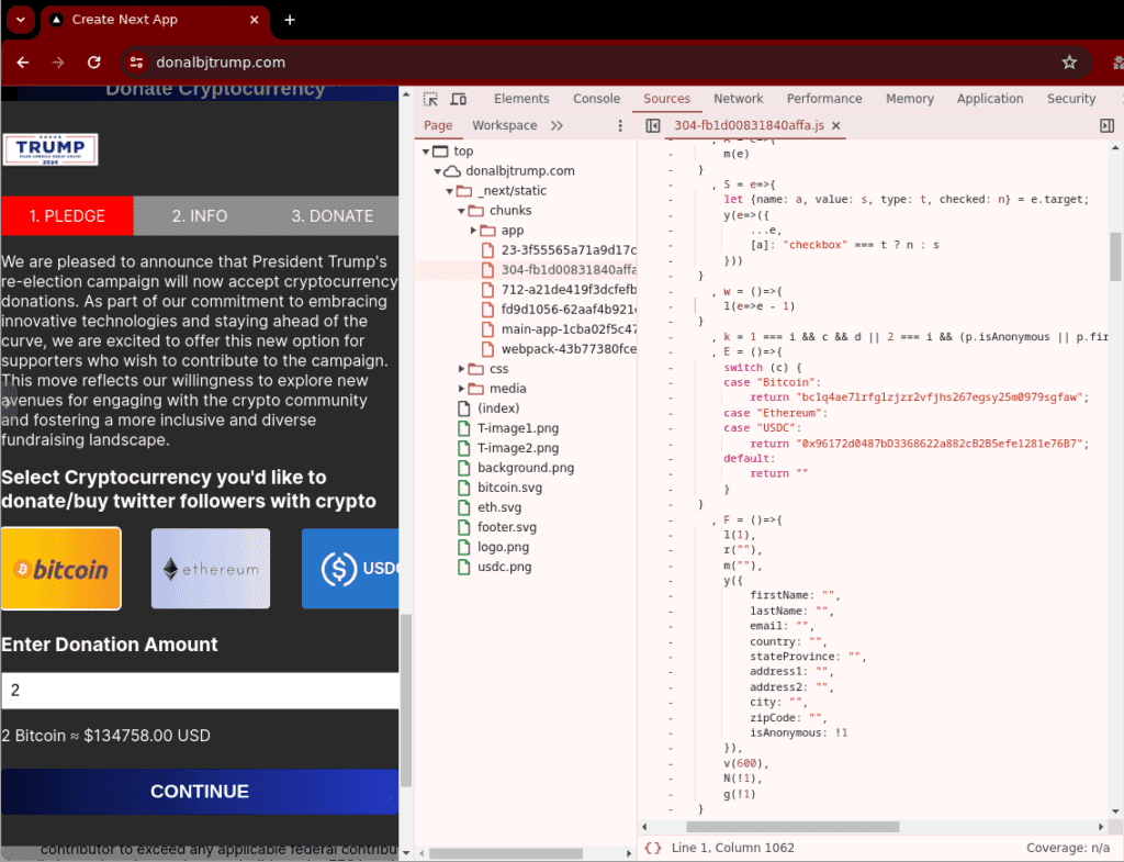 The donation scams use a variety of different techniques to replace the legitimate Coinbase Payments-based flow used by the Trump campaign, including phishing pages impersonating Coingate, and crypto payment flows using Plisio and Oxapay.