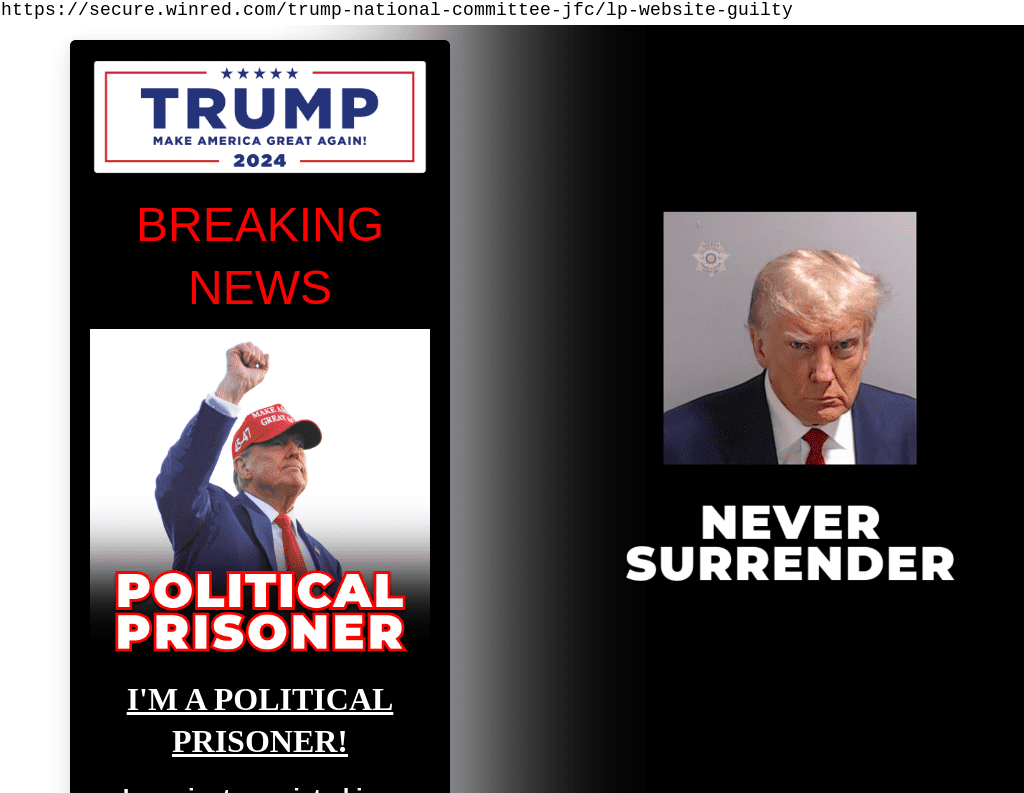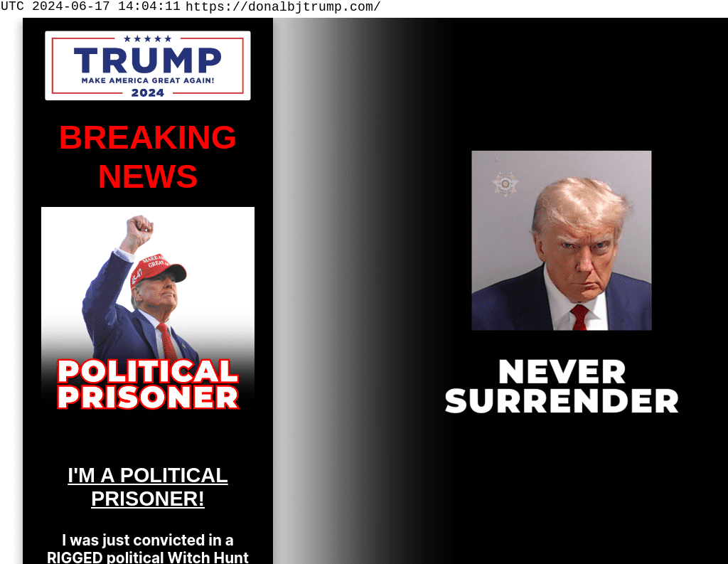 However, in addition to moving quickly, these scammers are actively monitoring the situation and making strategic adjustments to improve the scam. Initially, the site was created with the content featured in the screenshot above, however on May 31st, the day Trump’s guilty verdict was announced, this scammer adjusted quickly to mirror the “Never Surrender” narrative of the Trump campaign to take advantage of the urgency from Trump supporters and their potential victims. With the Trump campaign collecting more than $50M in a 24-hour period, there’s no telling how much might have been lured away by the criminals behind these scams.