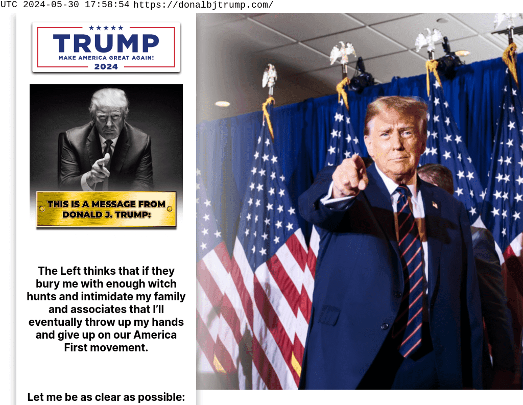 When the trial verdict was announced on May 31st, the Trump campaign immediately directed all incoming traffic to its site to the donation pages in order to capitalize on support from donors across the country. The campaign collected more than $50 million in the 24 hours following the verdict, but criminals also took note. Those behind these donation scams also identified the opportunity and immediately pivoted their strategy to mirror what was happening on the legitimate campaign site, with many direct impersonations of campaign resources.